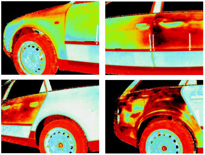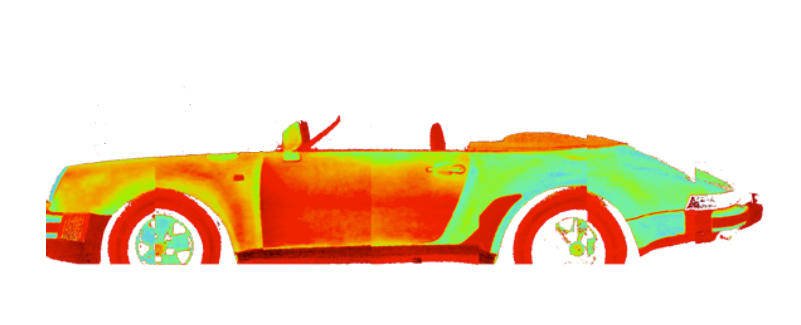 Das Ergebnis, eine infrarotdarstellung, die Erst- und Zweitlack, Füllmaterial, sowie Klarlack etc. unverkennbar darstellt. Dabei wird die Oberfläche mittels Lichtimpuls sowie stetiger Erwärmung gleichzeitig thermisch angeregt mit dem Ergebnis: